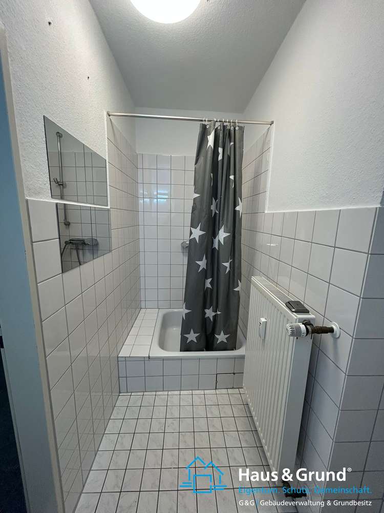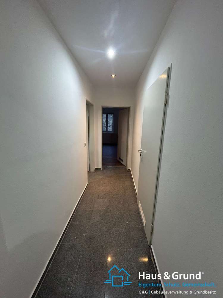 Über den langen Flur der Wohnung erreicht man das Bad, welches mit einer Dusche ausgestattet ist, sowie die große Küche mit angrenzendem Balkon und die beiden Zimmer, welche als Schlaf- und Wohnzimmer genutzt werden können.