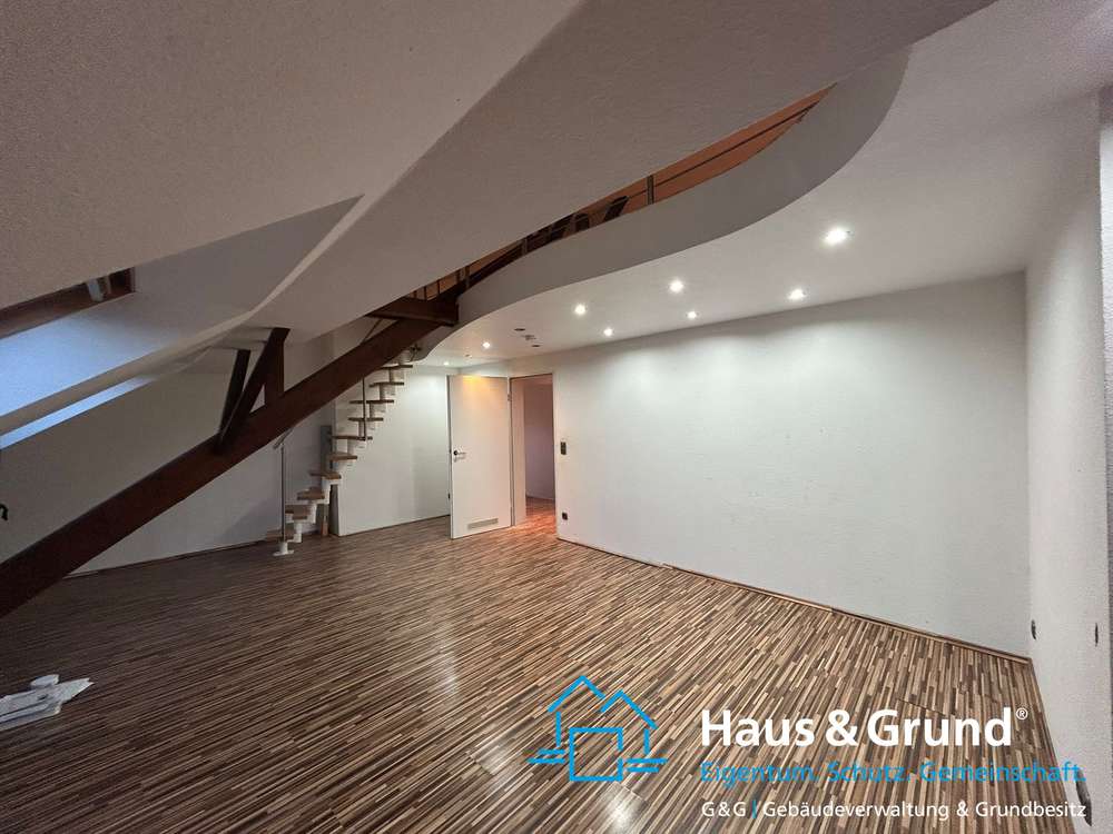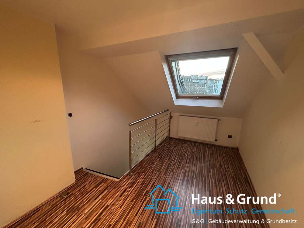 Über eine Treppe gelangt man in das Obergeschoss der Wohnung. Über einen kleinen Flur erreicht man einen weiteren Raum mit einer Treppe zur Empore.