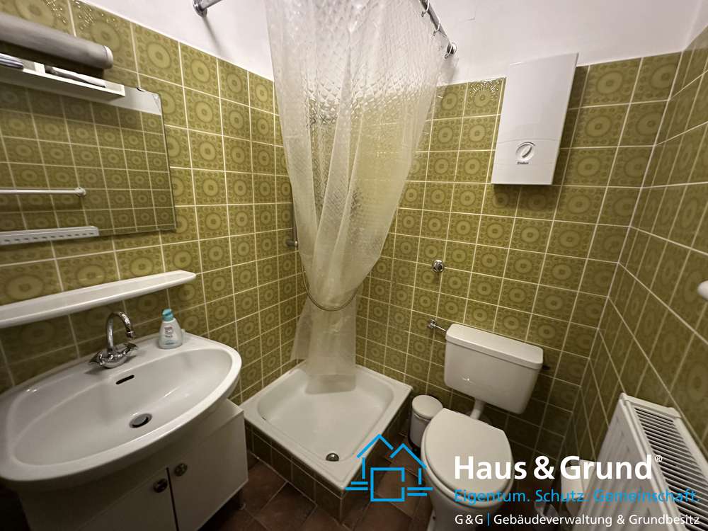 Die angebotene 2-Zimmer-Wohnung besticht durch dem Baujahr entsprechenden Charm des Hauses mit zum Teil braunen massiven Fliesen und einem urig gefliesten grünen Badezimmer.
