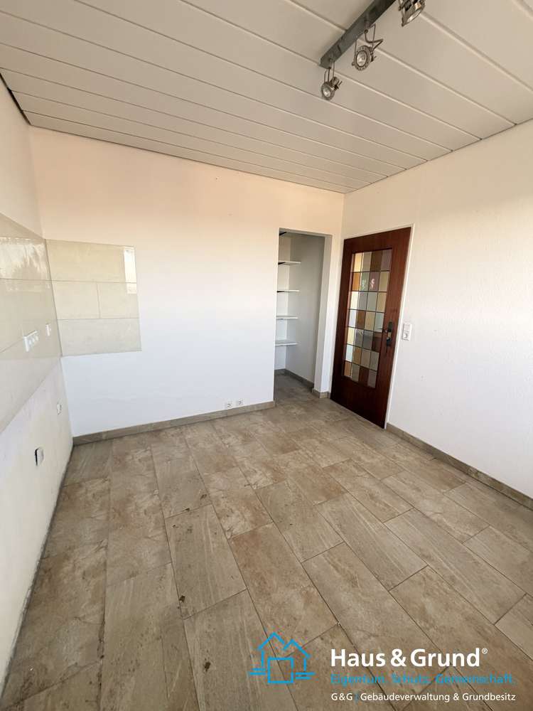 Die Küche ist lichtdurchflutet und modern gestaltet, mit hellbeigen Fliesen auf Boden und Fliesenspiegel im Kochbereich. Ein kleiner Abstellraum bietet zusätzlichen Stauraum. Auch hier sind die Decken mit weißen Paneelen versehen.