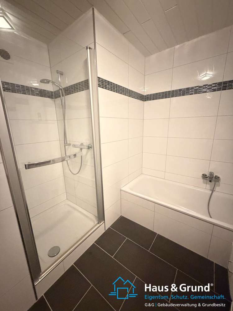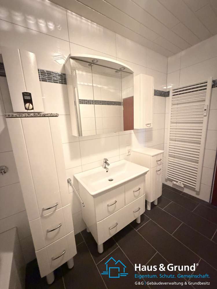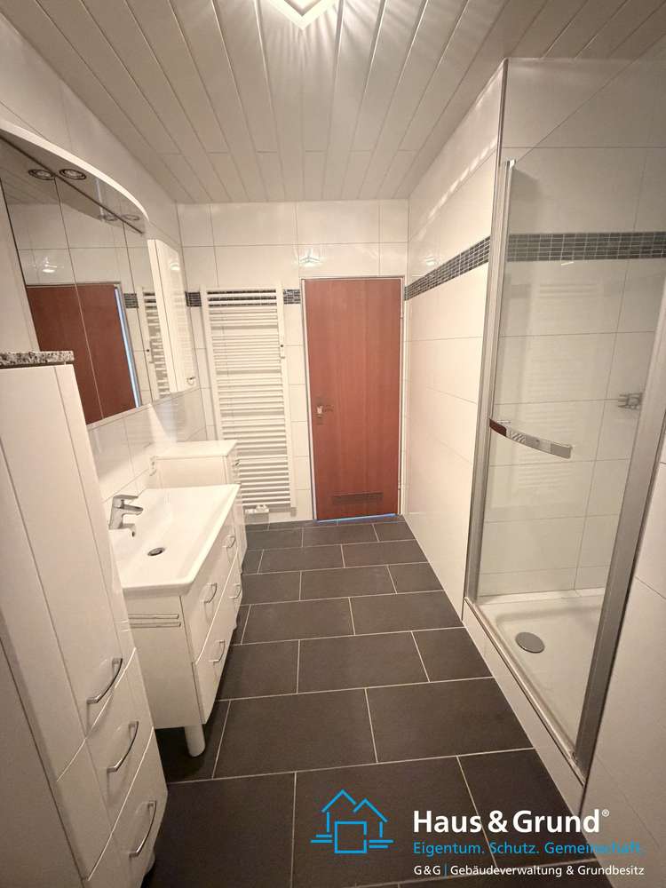 Das Badezimmer ist mit modernen, glänzend weißen Wandfliesen und matten anthrazitfarbenen Bodenfliesen ausgestattet. Es verfügt über eine Dusche mit Glasabtrennung, eine Badewanne, ein großes Waschbecken mit Unterschrank sowie einen praktischen Handtuchheizkörper.